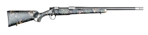 Left-hand bolt-action rifle chambered in 7mm Rem Mag with a 22" carbon fiber-wrapped stainless steel threaded barrel and removable side-baffle brake. Features a synthetic stock with green and black/tan accents, TriggerTech trigger, and Christensen Arms' Sub-MOA guarantee. Weighs 5.3 lbs with a 1:9 twist rate and 43.5" overall length.