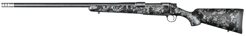 Left-hand bolt-action rifle chambered in 7mm PRC with a 22" carbon fiber threaded barrel and stainless steel Cerakote receiver. Features a fixed sporter carbon fiber stock in black with gray accents, TriggerTech trigger, and baffle brake. Weighs 5.3 lbs with sub-MOA accuracy guarantee.