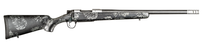 The Christensen Arms Ridgeline FFT is a bolt-action rifle chambered in 375 H&H with a 22" carbon fiber wrapped stainless steel threaded barrel. It features a carbon fiber stock with gray accents, TriggerTech trigger, and stainless steel drilled and tapped receiver, weighing just 5.3-5.4 lbs with a Sub-MOA accuracy guarantee.