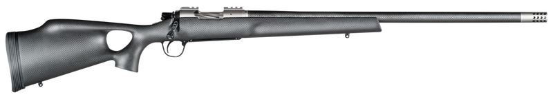 Bolt-action rifle chambered in 7mm PRC with a 26" carbon fiber wrapped threaded barrel and titanium receiver. Features a natural carbon fiber thumbhole stock, adjustable match trigger, integrated picatinny base, and radial muzzle brake. Weighs 5.5 lbs with 1:8" twist rate and includes a 1/2-MOA accuracy guarantee.