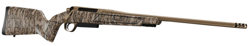 The Christensen Arms Evoke is a bolt-action rifle chambered in 7mm Remington Magnum with a 22" threaded barrel featuring an RFR muzzle brake and Flat Dark Earth Cerakote finish. It includes a Mossy Oak Bottomland synthetic stock with integrated Picatinny rail, TriggerTech premium adjustable trigger, and 4+1 capacity. Weight is 7.7 lbs with an overall length of 44-47.5".