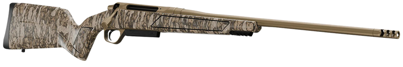 The Christensen Arms Evoke is a bolt-action rifle chambered in 7mm PRC with a 22" threaded #4 contour barrel finished in Flat Dark Earth Cerakote. It features a proprietary Christensen Arms action, TriggerTech premium adjustable trigger, RFR-style muzzle brake, and ships with a 4+1 capacity detachable magazine. The Mossy Oak Bottomland fixed hybrid hunter synthetic stock includes an integrated Picatinny rail for optics mounting and swivel sling studs.