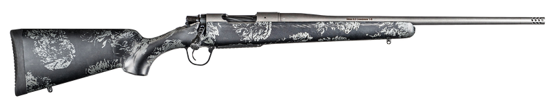 The Christensen Arms Mesa FFT is a bolt-action rifle chambered in 7mm PRC with a 22" button-rifled stainless steel barrel featuring a seamless removable radial muzzle brake. It weighs 5.5 lbs and includes a carbon fiber sporter stock in black with gray accents, drilled and tapped for optics, and is backed by the Christensen Arms Sub-MOA Guarantee.