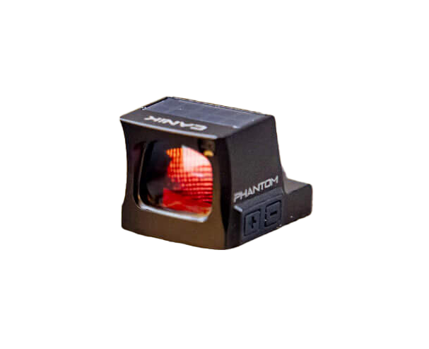 The Century Arms Phantom is a 1x magnification red dot sight with a 3/32 MOA reticle designed for Trijicon RMR footprint mounting. It features illuminated reticle technology with Shake Awake/Auto On-Off functionality and operates on a CR1620 battery with approximately 50,000 hours of battery life.