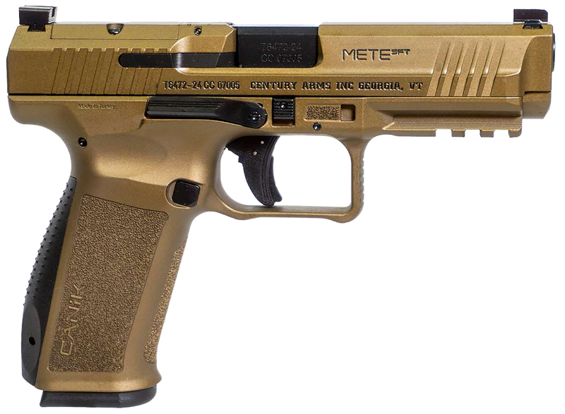 The Canik Mete SFT is a 9mm striker-fired semi-automatic pistol featuring a 4.46" barrel and 20+1 round capacity. The optics-ready slide includes serrated surfaces and 3-dot sights, while an integrally flared mag-well, aggressive grip texturing, and undercut trigger guard enhance control and handling. Finished in burnt bronze cerakote with bronze polymer grips, this pistol weighs 27.9 oz and includes two magazines (one 18-round and one 20-round) plus two optics mounting plates.