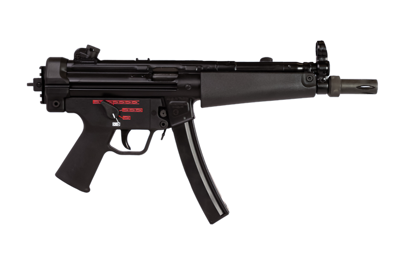 Semi-automatic pistol chambered in 9mm with an 8.9" cold hammer-forged threaded barrel ready for suppressors and modern accessories. Features a polymer frame, adjustable sights, manual safety, ambidextrous controls, and includes two 30-round magazines. Matte black finish with stamped steel receiver maintains classic MP5-style handling and durability.