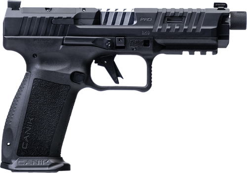 The Canik Mete SFT Pro is a 9mm Luger semi-auto pistol with a 5" barrel and optic-ready, serrated slide. It features an 18+1 round capacity, interchangeable backstrap grips, and a loaded chamber indicator. Dimensions are 5" barrel length, 3" height, and 9" width.