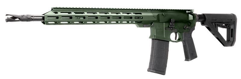 Semi-automatic AR-platform rifle chambered in 5.56 NATO with a 16" cold hammer forged barrel and 30-round capacity. Features US Palm furniture, Magpul DT carbine stock, ambidextrous controls, Hyperfire EDT trigger, threaded barrel with flash hider, and Type III hardcoat anodized storm green finish. Overall length ranges from 33.5" to 36.8" with a weight of approximately 7 lbs.
