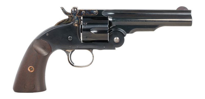 Single-action revolver chambered in 45 Colt with a 5" barrel, blued steel finish, and walnut grips. Holds 6 rounds and features a design based on the historic Schofield model used by the U.S. Cavalry. Classic western-style revolver suitable for sport shooting and historical reenactment.
