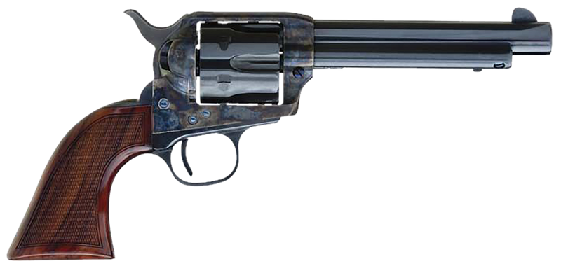 Single-action revolver chambered in .45 Colt with a 5.5" blued barrel and color case hardened frame. Features a 6-round capacity, exposed hammer, checkered walnut grips, and fixed blade front/notched rear sights. Weighs 2.50 lbs with an overall length of 11.10".