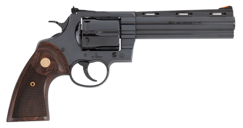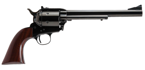 Single-action revolver chambered in .44 Magnum/.44 Special with a 6" blued octagon barrel and 6-round capacity. Features a blued steel frame, walnut grips, exposed hammer, and adjustable target sights. Weighs 41 oz and measures 14.1" in overall length.