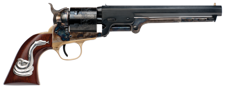 Single-action revolver in .38 Special with a 7.5" blued steel barrel and color case hardened frame. Features a 6-round capacity, brass bead front sight, and walnut grips with inlaid sterling silver rattlesnake. Weighs 3.05 lbs and is an accurate reproduction of the iconic 1851 Conversion used in classic Spaghetti Western films.