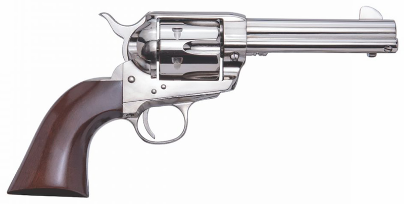 Single-action revolver chambered in .45 Colt with a 4.75" nickel-plated barrel and 6-round capacity. Features a nickel-finished steel frame and cylinder, walnut grips, and fixed front sight. Weighs approximately 2.5 lbs with overall length of 14.2".