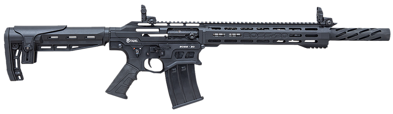 The Citadel Boss30 is a 12 gauge semi-automatic shotgun with a 3" chamber and 18.75" threaded steel barrel. It features a matte black Cerakote finish, aluminum receiver with Picatinny rail, adjustable cheek riser synthetic stock, and adjustable folding front and rear sights. This 5+1 capacity tactical shotgun is ambidextrous and measures 37.75" overall length.