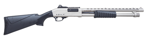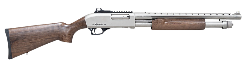 The Citadel Mariner is a 20 gauge pump-action shotgun with a 3" chamber, 18.5" nickel-finished heat shield barrel, and 4+1 capacity. It features a nickel-finished aluminum receiver with Picatinny rail, adjustable rifle sights, and a fixed walnut stock. This compact tactical shotgun weighs 6.9 lbs and includes a side shell holder for convenient ammunition access.