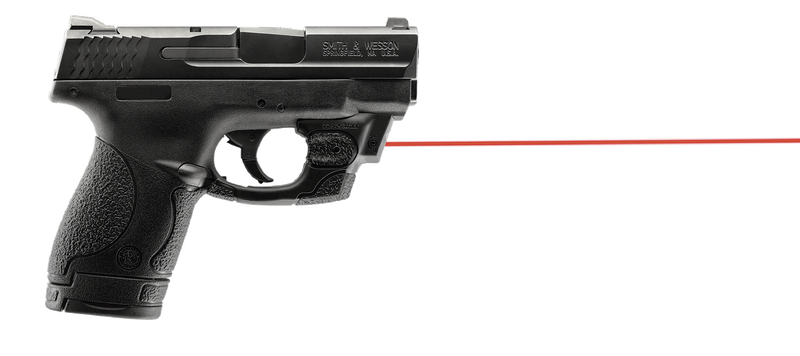 Red laser sight designed for Smith & Wesson Shield and Shield M2.0 pistols in 9mm and .40 S&W calibers. Features a 5mW laser with 50-meter effective range, trigger guard mount, and windage/elevation adjustments. Includes ambidextrous activation and requires a 1/3N battery.