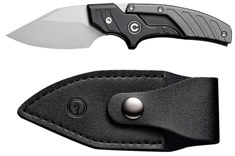 The CIVIVI Typhoeus is a fixed blade knife featuring a 2.27" stonewashed 14C28N steel blade with a plain edge and a 3.98" black/gray textured aluminum handle. With an overall length of 6.25" and weighing 3.25 oz, this knife comes with a leather sheath and is designed for general cutting tasks and outdoor use.