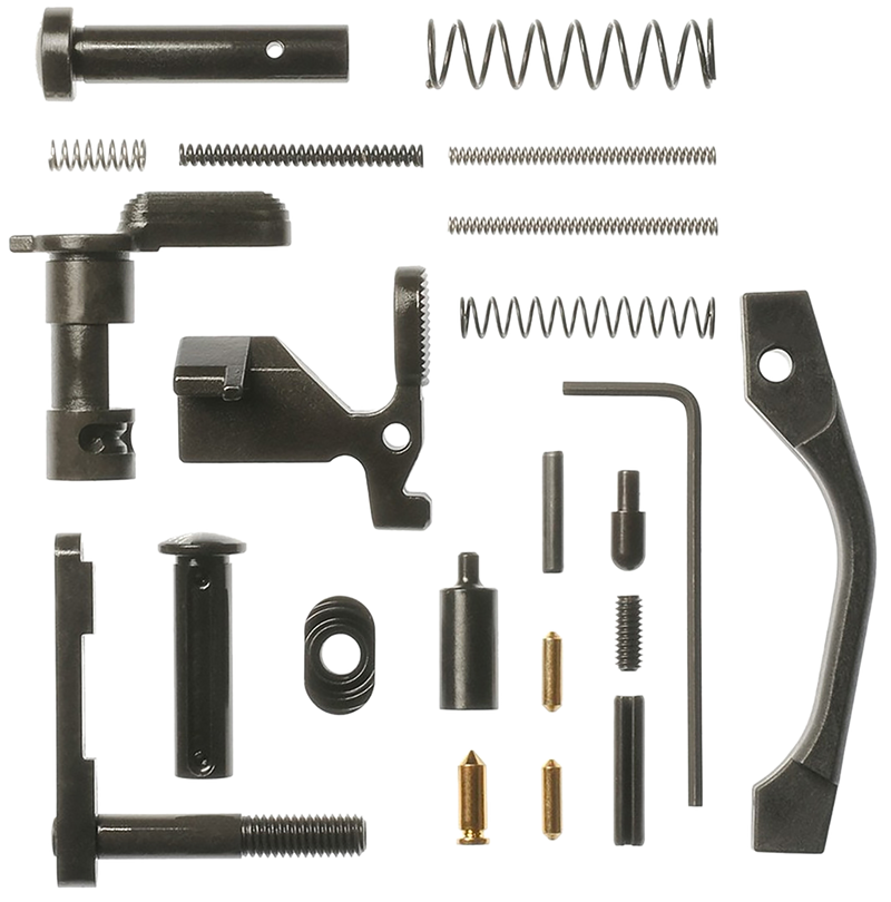 CMC Triggers Lower Parts Kit for AR-15 platform firearms, suitable for multi-caliber builds. This kit includes bolt catch, mag release, safety, buffer retainer, and associated springs and pins, but excludes fire control group and pistol grip. Ideal for amateur builders and gunsmiths completing an AR-15 lower receiver assembly.