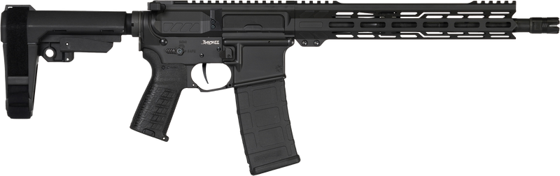 Semi-automatic AR pistol chambered in 300 Blackout with a 12.5" black nitride threaded barrel and 30+1 round capacity. Features a 7" M-LOK handguard, optics-ready Picatinny rail receiver, ambidextrous controls, and pistol stabilizing brace. This compact platform delivers subsonic suppressed performance in a highly customizable AR-based pistol.