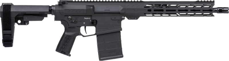 Semi-automatic AR pistol chambered in 8.6 Blackout with a 12.5" threaded barrel and 20-round capacity. Features a pistol stabilizing brace, ambidextrous controls, optics-ready upper, and 7075-T6 aluminum construction with M-LOK handguard. Weighs 7.4 lbs and includes one magazine.