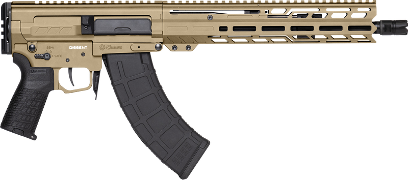 The CMMG Dissent MK47 is a 7.62x39mm semi-automatic rifle featuring a 12.5" black nitride threaded barrel and coyote tan cerakote aluminum receiver with Picatinny rail. It includes M-LOK handguards and ships with a 30+1 round capacity magazine. Weighing 6.7 lbs with a 22.4" overall length, this compact rifle is designed for modern tactical use.