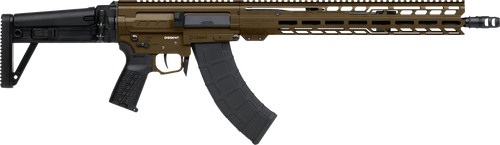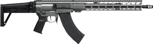 Semi-automatic rifle chambered in 7.62x39mm with a 16.1" threaded barrel and 30-round capacity (includes 2 magazines). Features CMMG's bufferless DISSENT operating system, side-folding stock with adjustable length of pull, ambidextrous controls, M-LOK handguard, and ZEROED muzzle brake. Weighs 7.7 lbs with Cerakote Armor Black finish.