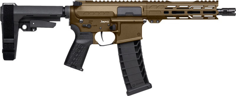 Semi-automatic AR pistol chambered in 9mm Luger with an 8" threaded barrel and 1/2x28 thread pitch. Features ambidextrous controls, pistol stabilizing brace, optics-ready platform, and Cerakote Midnight Bronze finish. Includes one 30-round magazine and weighs approximately 5 lbs.