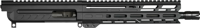 This CMMG Dissent upper receiver is chambered in 9mm Luger and features a 10.50" barrel with a zeroed linear compensator. It includes a 9.60" M-LOK handguard and left side charging handle, designed to fit standard AR-platform lower receivers with a Picatinny end plate.