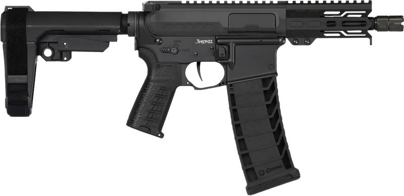 Semi-automatic AR-15 platform pistol chambered in 9mm Luger with a 5" barrel and 30-round capacity. Features a billet aluminum upper receiver, forged lower receiver, ambidextrous controls, pistol stabilizing brace, and optics-ready rail. Includes CMMG Linear Comp muzzle device with 1/2x28 thread pitch and ships with one magazine.