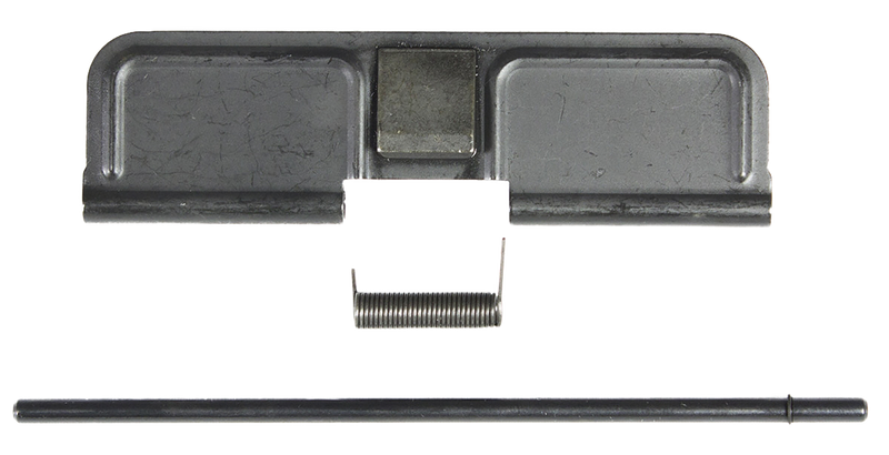 AR-15 compatible ejection port cover kit made from 6061-T6 aluminum in black finish. Includes ejection port rod and spring to keep dust and debris away from the ejection port. Dimensions are approximately 4.0" L x 2.5" W x 0.7" H.