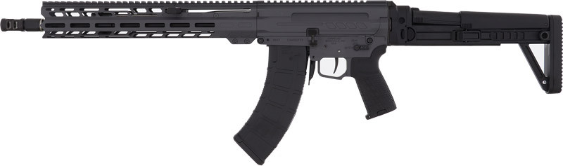 The CMMG Dissent MK47 is a 7.62x39 semi-automatic rifle featuring a 14.3" barrel and 30-round capacity. It includes a folding stock for compact storage and transport. The grey finish provides a modern tactical appearance.