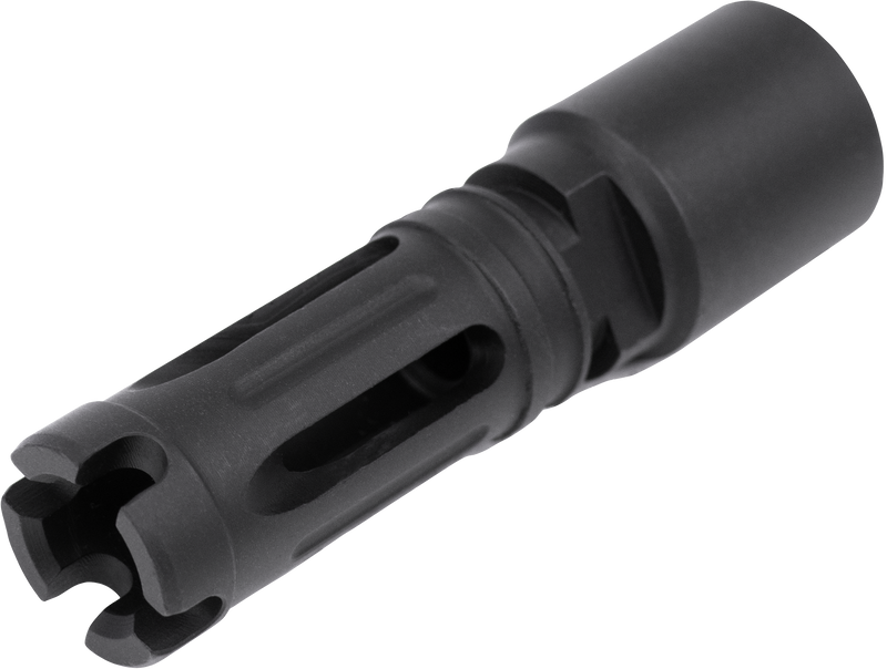 This is a muzzle mount designed for CMMG Defcan 57 platforms in 4.6mm and 5.7mm calibers. The mount features a 1/2-28 thread pitch and is constructed from steel. It is a zero-capable muzzle device that allows for precise mounting and alignment on compatible firearms.