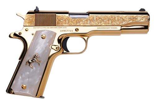 The CNC Firearms Kimber 1911 Patria is chambered in 38 Super with a 9+1 round capacity. Features include a gold-plated PVD barrel, polished stainless steel engraved and serrated slide, stainless frame with gold accents, and pearl grips. Overall length is 8.25 inches with a width of 1.3 inches.