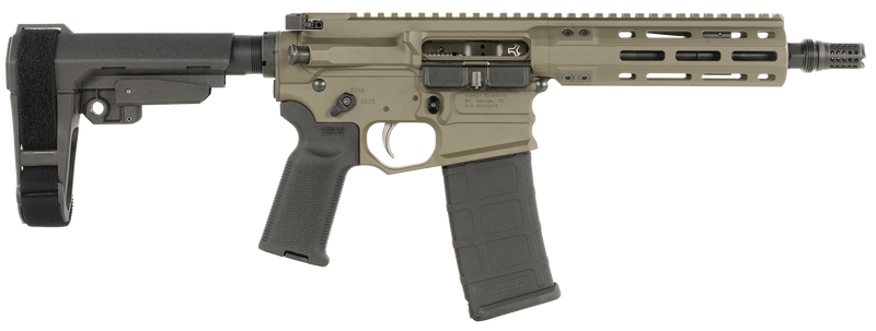 Semi-auto pistol chambered in 300 Blackout with a 7.5" black melonite barrel and 30+1 round capacity. Features a CK green aluminum receiver with picatinny rail, SB Tactical SBA3 brace, and ambidextrous safety lever. No sights included; optic-ready platform with 39" overall length.