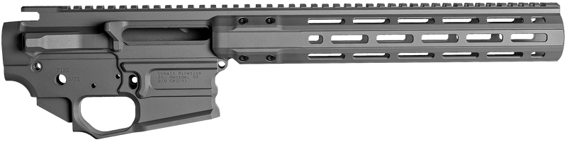 Cobalt Kinetics CK-Pro Receiver Set for 5.56 NATO rifles with a 16" barrel configuration. This upper and lower receiver set is designed for semi-automatic rifle builds and features a black finish. Dimensions are 19.3" length x 12.3" width x 3.3" height.