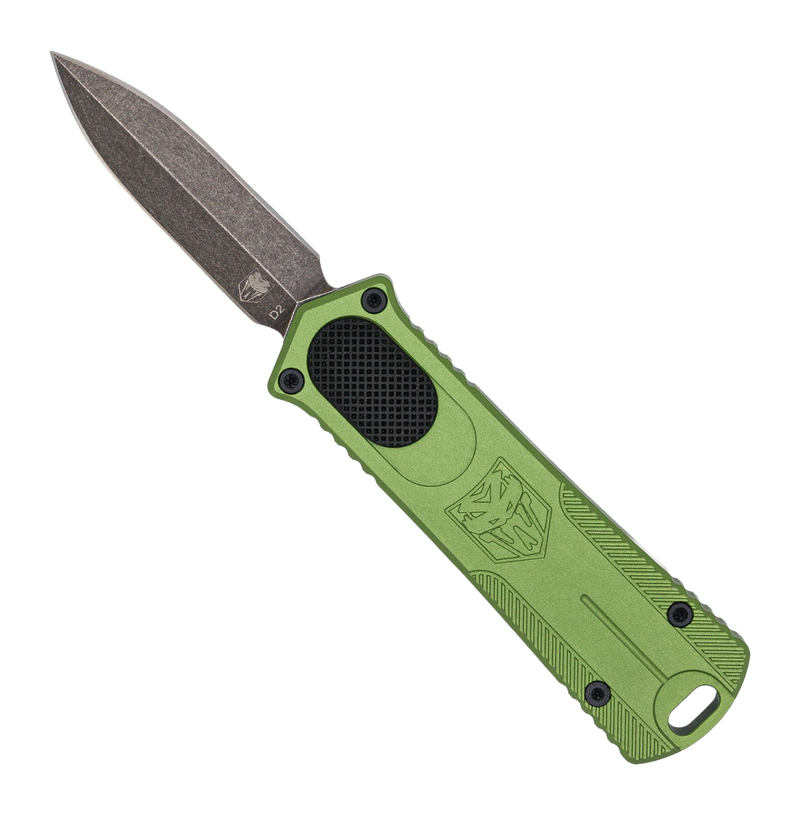 This is an automatic double-action out-the-front (OTF) dagger knife featuring a 2.0" D2 steel blade and 6061-T6 aluminum handle in OD green. The knife has an overall length of 5.12" and comes with a carrying pouch.