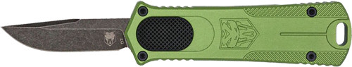 This is a 1.75" out-of-the-front (OTF) dagger knife with a stonewashed D2 steel blade and OD green anodized aluminum handle. The knife features a push-up opening mechanism and has an overall length of 4.75" when deployed. Weighing 1.60 oz, it is designed as a compact tactical knife for general cutting tasks.