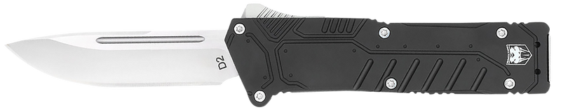 The Cobratec Special Forces is a 3.25" OTF (out-the-front) automatic knife featuring a drop point blade made from D2 steel with a plain satin finish. It has a black textured anodized aluminum handle and comes with a nylon sheath, with an overall length of 8 inches when deployed.