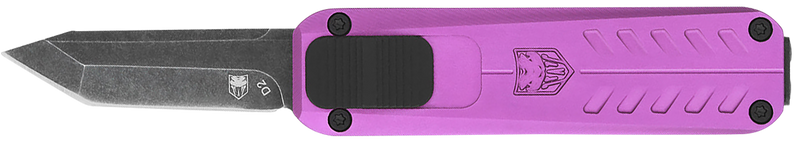 This is a 1.75" OTF (out-the-front) tanto blade knife made from D2 steel with a stonewashed finish. The purple anodized aluminum handle measures 4.75" overall length and includes a pocket clip and carrying pouch.