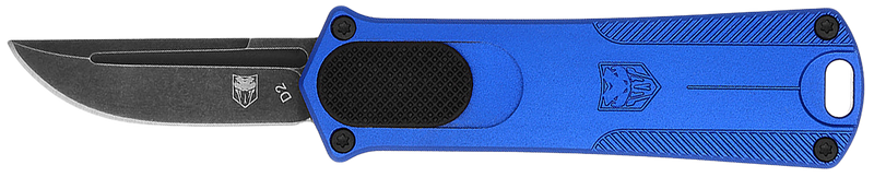 CA-compliant OTF (out-the-front) knife with a 1.75" drop point blade made from D2 steel and a 3" blue anodized aluminum handle. The blade features a stonewashed black finish, and the knife has an overall length of 4.75" when closed. Designed for everyday carry and general cutting tasks.