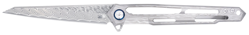 The Cobratec Ghost is a folding knife featuring a 3.88" Damascus wharncliffe blade with a plain edge and a titanium handle with cut-out design. It has an overall length of 9" when open and weighs 2.40 oz, making it a lightweight option for everyday carry. The knife operates with a push-up opening mechanism.
