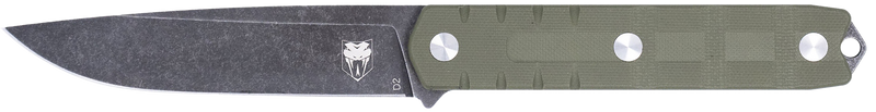 Fixed blade knife featuring a 4.5" stonewashed D2 steel drop point blade with plain edge. Comes with OD green textured G10 scales handle and includes a Kydex sheath. Overall length is 9.5" with a total weight of 5.2 oz, suitable for outdoor and tactical applications.