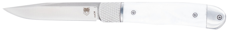 A compact folding knife featuring a 3.13" 154CM stainless steel blade with a plain edge and bolster hidden release mechanism. The knife has white abalone scales on the handle with an overall length of 7.38" when open and weighs 4 oz, making it suitable for everyday carry and general cutting tasks.