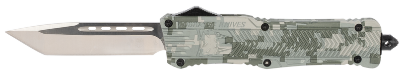The Cobratec CTK-1 is a large out-of-the-front (OTF) tactical knife featuring a 3.75" D2 steel tanto blade with a plain edge and army digital camouflage aluminum handle. The knife includes a glass breaker and comes with a pocket clip for carry, with an overall length of 9.5" when deployed. It ships with a nylon sheath and weighs 9 ounces.