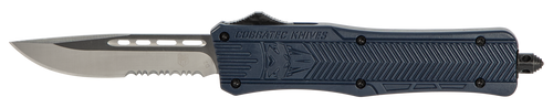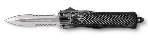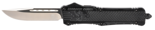 This is a large out-the-front (OTF) knife featuring a 3.75" drop point blade made from D2 steel with partial serration, housed in a black aluminum handle. The knife includes a glass breaker feature, pocket clip, and trigger-actuated opening mechanism, with an overall length of 9.5" and nylon sheath included.