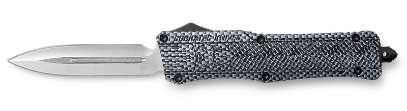 The Cobratec CTK-1 Large is a 3.75" out-the-front (OTF) dagger knife featuring a plain D2 steel blade paired with a carbon fiber aluminum handle. It includes a glass breaker feature, pocket clip, and nylon sheath, with an overall length of 9.5" and weight of 9 oz.