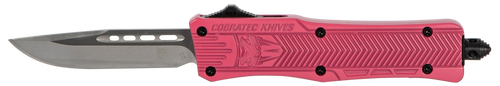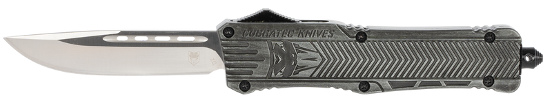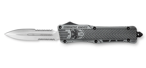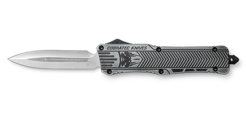 The Cobratec CTK-1 is a large out-the-front (OTF) automatic knife featuring a 3.75" drop point blade in D2 steel with a plain edge. The stonewashed aluminum handle includes a glass breaker and comes with a nylon sheath and pocket clip for versatile carry options.