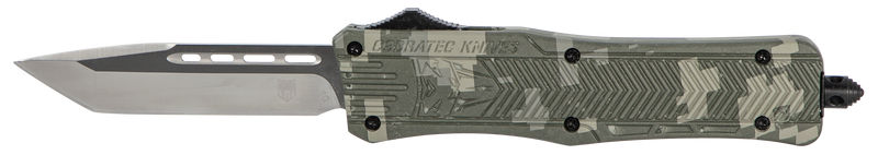 This is a medium-sized out-of-the-front (OTF) knife featuring a 3" D2 steel tanto blade with a plain edge and a 6.7" closed length. The Army DigiCamo aluminum handle includes a glass breaker and comes with a pocket clip for convenient carry.