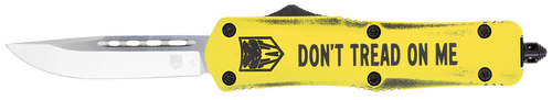 The Cobratec FS-3 is a medium-sized out-of-the-front (OTF) automatic knife featuring a 3" D2 steel drop point blade with a plain edge. The knife has an overall length of 8" with a black aluminum alloy handle and includes a glass breaker and nylon sheath, making it suitable for tactical and utility applications.