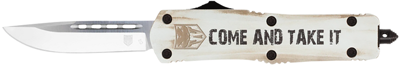 This Cobratec FS-3 is a 3-inch OTF (out-the-front) knife featuring a plain D2 steel tanto blade with a white cerakoted aluminum handle emblazoned with "Come And Take It" graphics. The knife includes a glass breaker, pocket clip, and comes with a nylon sheath; it has an overall length of 4.5 inches and weighs 6.3 ounces.